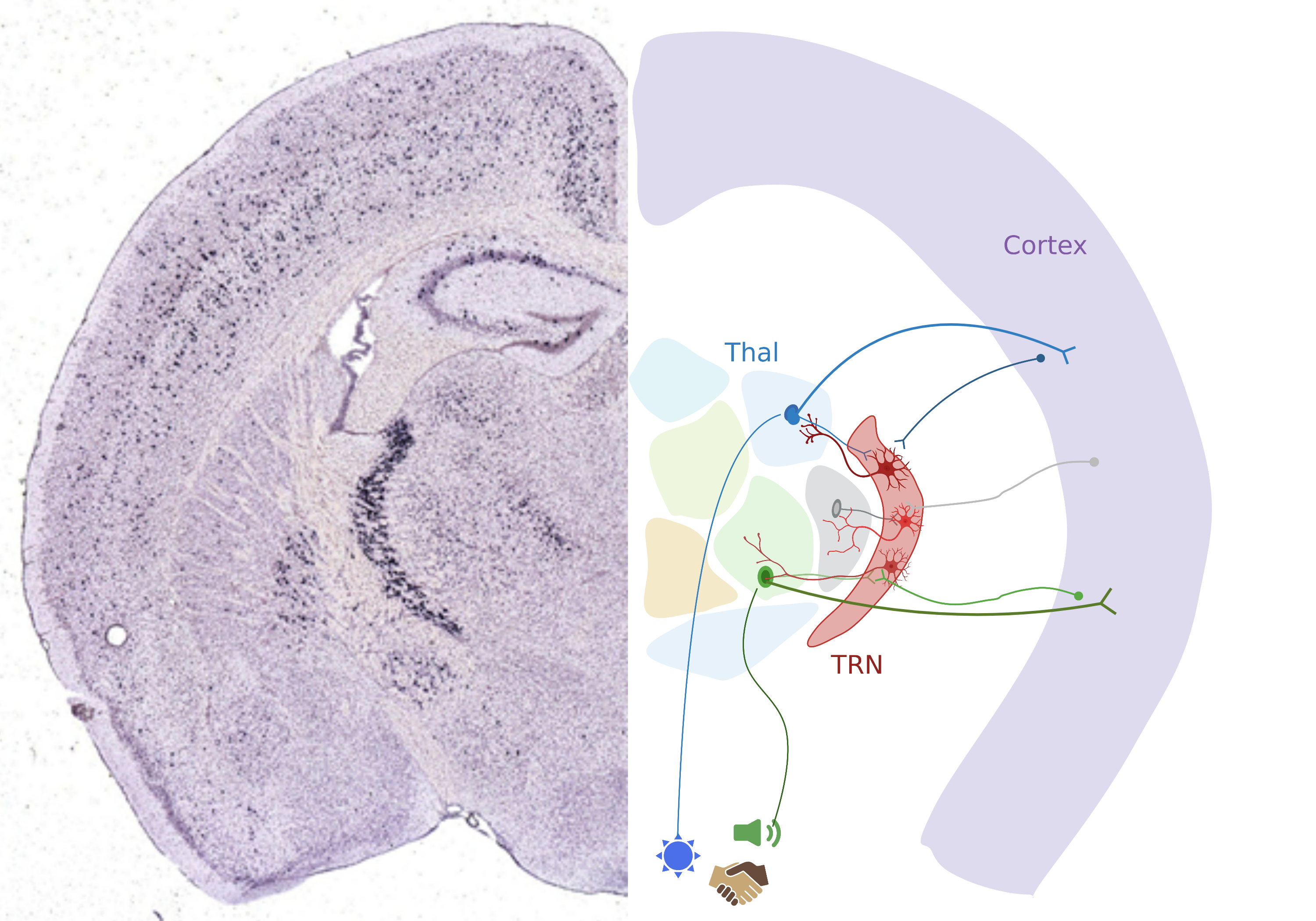 Information from the sensory surround transmits through the nuclei of the thalamus en route to the cortex. The thalmic reticular nucleus (TRN) sits between these structures and shapes thalamic activity through the inhibitory synapses sent to thalamus. TRN cells notably communicate with each other using electrical synapses.